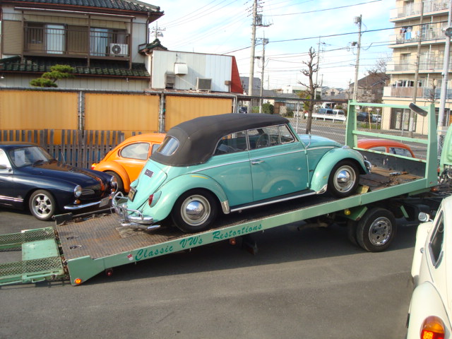 無事にご自宅に着いたようで安心しています。程度のとても良いワーゲンビートルなので心配がありましたが、とても良いガレージに保管されるようで嬉しく思います。右側の黒いゴルフは外に出されてしまったのですね(^^)
