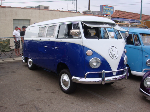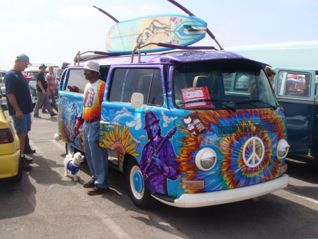 ワーゲンバスにエアバックをつけて車高調整。「もったいない」と、私も思いますが。いろいろな好みの人がいるから、アメリカではワーゲンのマーケットが盛んなのでしょうね。