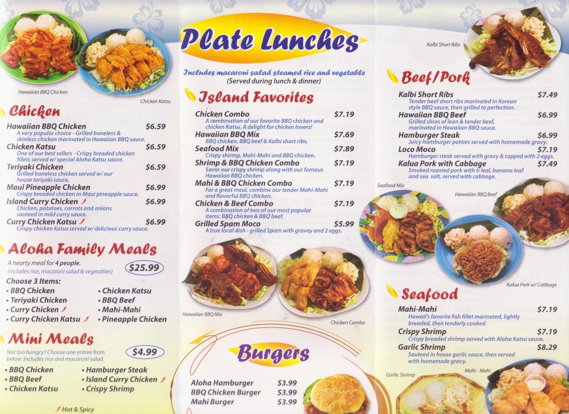 ロスに出張のときに現地の人に連れて行かれたハワイアンBBQのランチです。メニューを見てください。金額はそこそこですが、量が・・・。アメリカ人はお昼からこんなに沢山の食事をするので大きな人が多いのでしょうね。