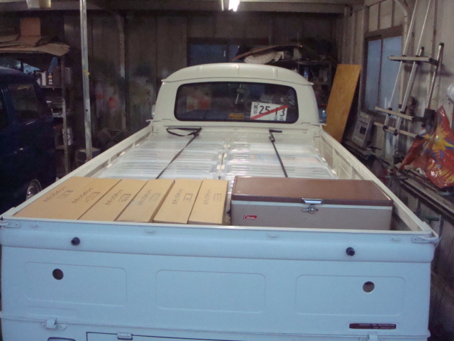 こちらのクルーキャブは近所の植木屋さんが配達用に使う予定です。リアバンパーにコマーシャルを書いきました。ナンバーは84(ヤシ)。