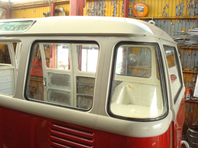 23wのガラスインストール作業をしました。ウインドガラスの多いバスは大変です。コーナーガラスのときはとても気を使います。ここまで行けば一安心。休憩の時間となりました。