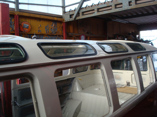 バスの中で1番ガラス窓があるので取り付けするのも時間が掛かります。ルーフサイドにはスカイライトウインドウが8枚。7枚は綺麗に入りました。最後の1枚を取り付ける前で本日の作業は終了しました。夕方冷えてきたので明日の仕事にしましょう!この様子で3月に納車できるかとても心配です。