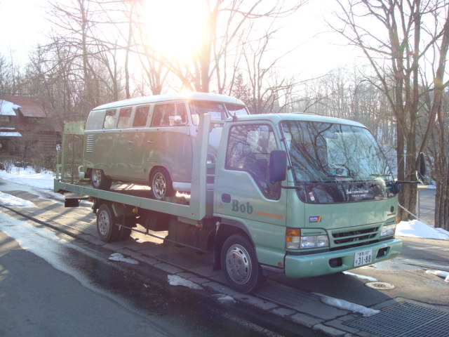 コンビバスが入庫予定が有ります。当社のトラックの上に乗っている車両ですが、店頭に到着する前に塗装の痛みを修理する為に板金工場にストレートで運んでしまいました。外側を化粧直ししてから皆様にご紹介します。少し先になりますがお待ちください。先取りしたいお客様はいつでもご連絡ください。