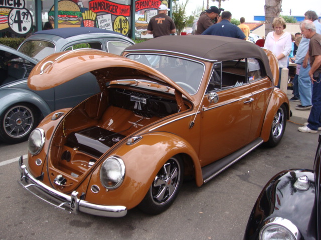 ワーゲンバスにエアバックをつけて車高調整。「もったいない」と、私も思いますが。いろいろな好みの人がいるから、アメリカではワーゲンのマーケットが盛んなのでしょうね。