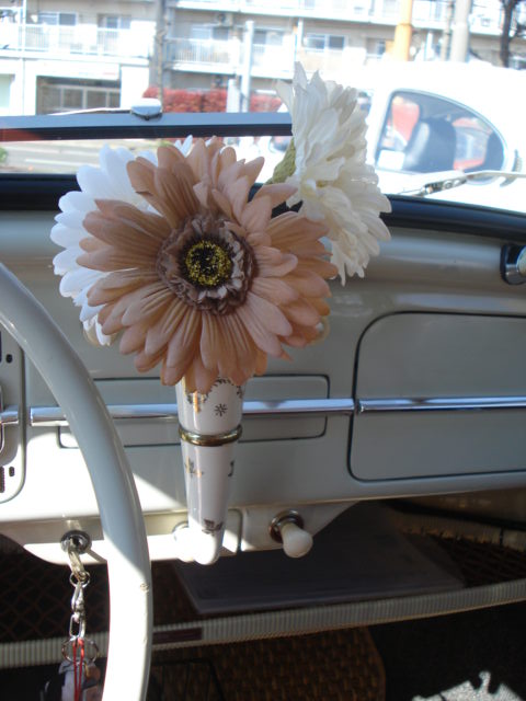 ビンテージワーゲンに花瓶をつけて造花をさして。