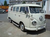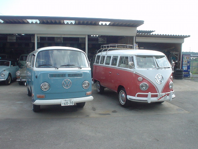 右側の15Wは夕方引取りに来られ、夜の走行で大阪まで帰宅される予定です。そして明日、ご自信で陸運事務所でナンバーを付けます。しかし、本日も気温が高温ですから少し心配なところがあります。お客様も不安がありレッカーサービスにも入会していただきました。納車整備をシッカリしましたが、44年経過しているワーゲンバスですから・・。