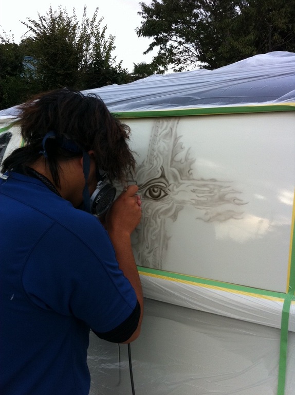 カスタムペイントの作業風景です。細かいペイントはとても神経を使うでしょう。完成が楽しみです。